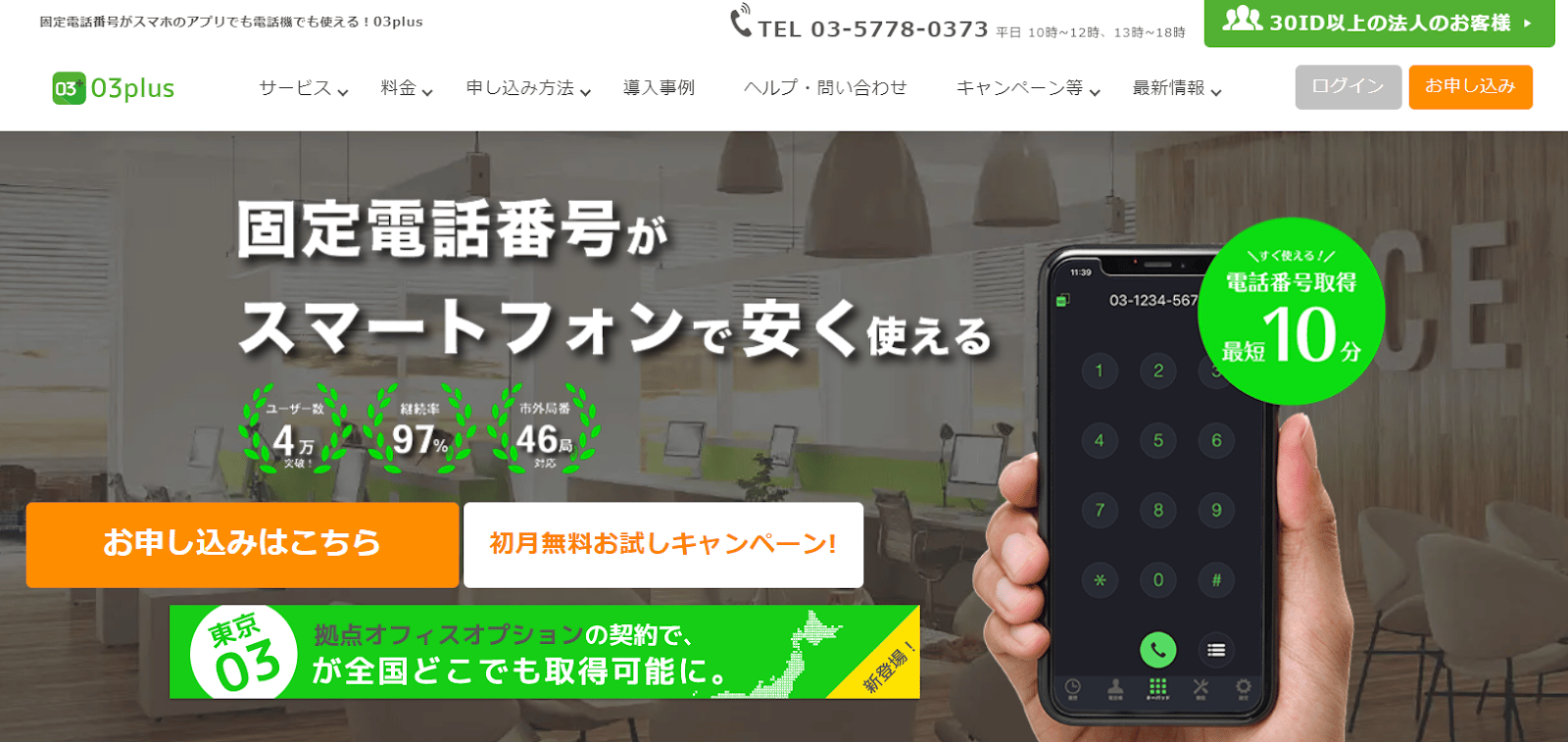 該当する市街地に事業所があれば固定番号を安く取得できるのが特徴です。