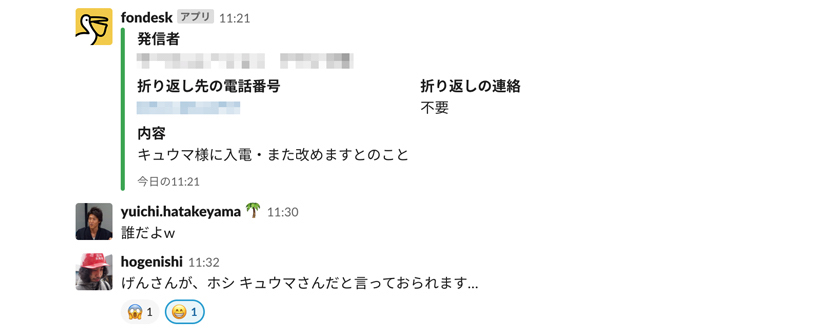 うちはフルリモートOKにしている会社だから、fondeskのSlack通知があるだけで、受電の報告を場所に関係なく受け取れるのがすごくマッチしました。