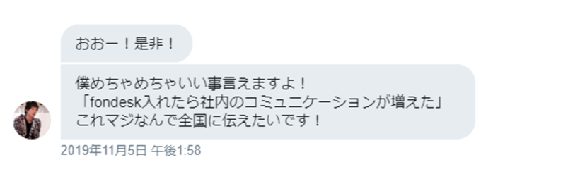 そういえば、インタビューのときに言おうと思っていたことがあって。全く予期していなかったんですけど、fondeskを入れてから社内のコミュニケーション量がメチャクチャ増えたんですよね。